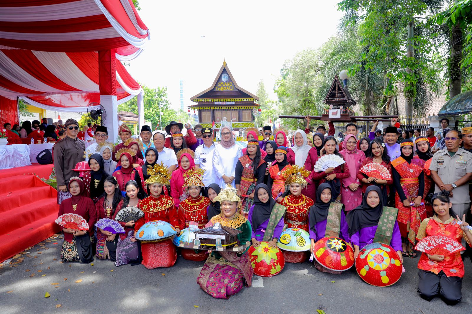 Dari atas panggung kehormatan, selain menerima sambutan dan hormat dari para peserta, Gubernur Hidayat Arsani juga turun langsung menyapa dan berfoto bersama peserta pawai dan masyarakat sekitar yang ikut menonton.